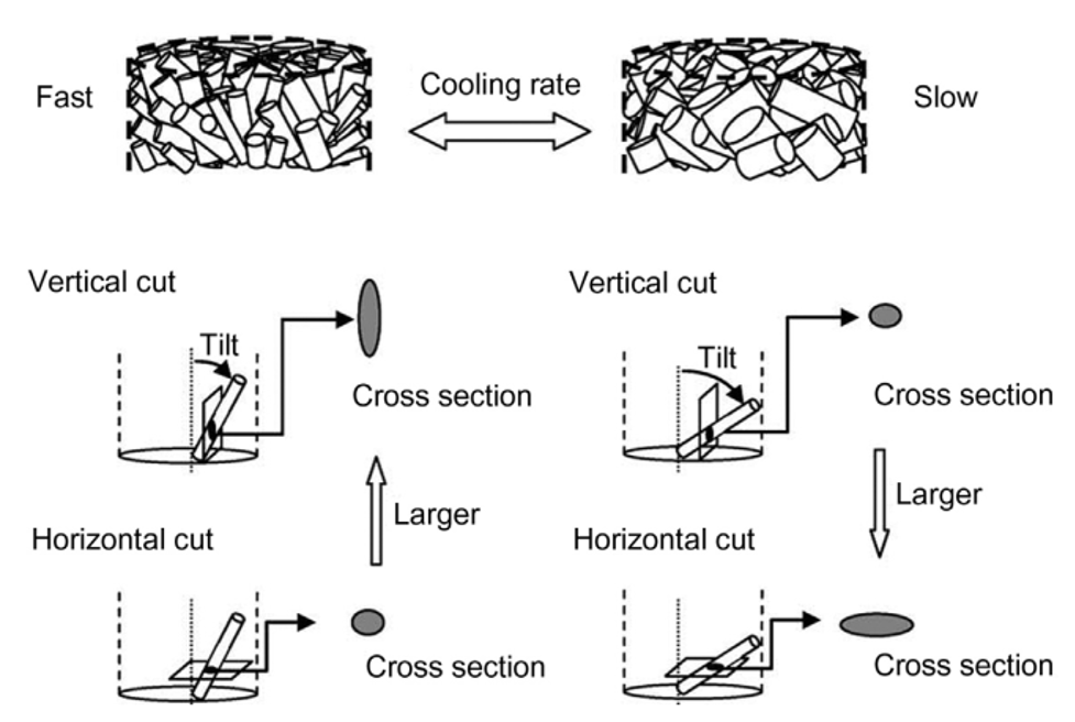 به عنوان مثال، با استفاده از CNT برای داربست کیتوزان برای افزایش خواص مکانیکی آن، ناهمگونی ساختار به دلیل این واقعیت که رسانایی حرارتی بالای CNT ها می تواند گرادیان دما را تشویق کند و همچنین سرعت انجماد را تقویت کند، افزایش می یابد. در نتیجه، بسته به موضوع بافت، می توان با اعمال نرخ انجماد سریع، داربست سه بعدی متراکم هم تراز با اندازه منافذ کوچک را طراحی کرد یا یک داربست سه بعدی لوله مانند با تخلخل بالا با سرعت آهسته انجماد تولید کرد. باید توجه داشت که سطح مقطع عمودی داربست سه بعدی لوله مانند بسته به جهت منافذ متفاوت از مقطع افقی به نظر می رسد، همانطور که در شکل زیر نشان داده شده است. سایر پارامترهای ابزاری، مانند دمای قفسه و فشار محفظه در طول مرحله خشک کردن، می توانند بر سرعت تصعید تأثیر بگذارند. برای داشتن سرعت تصعید بالا، فشار کمتر و دمای قفسه بالاتر با توجه به نقطه ذوب داربست توصیه می شود.